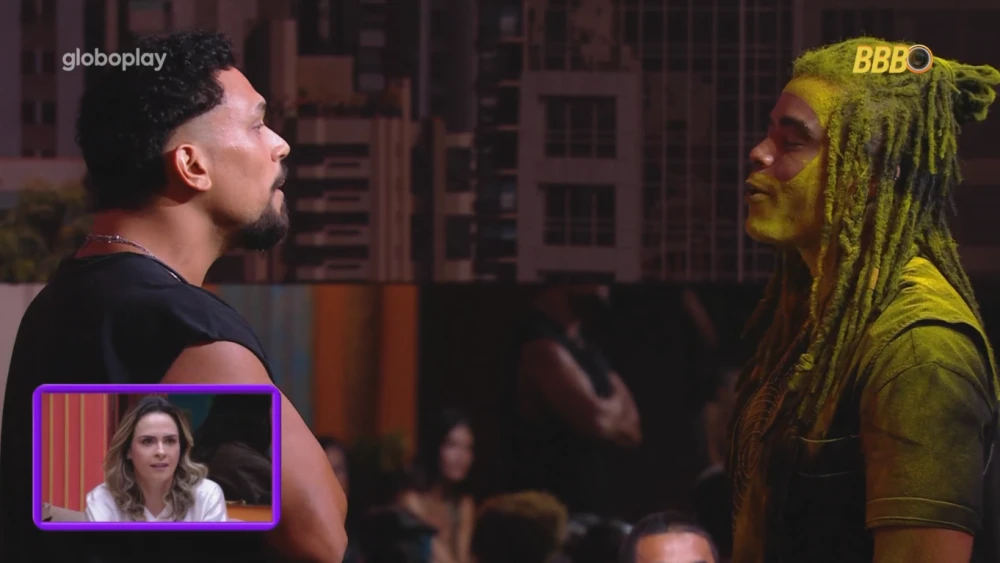 “Não viaje não? Você podia ter sido um pouco mais claro”, dispara o ator, que se aproxima de Vinícius para confrontá-lo. “Quando você sair você pesquisa”, responde o baiano.